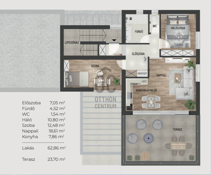 Eladó a III. kerület közkedvelt, zöldövezeti részén, az Almáskert utcában egy 61 m²-es, 3 szobás, újépítésű lakás, egy mindössze négy lakásos, exkluzív társasház első emeletén.Az ingatlan modern kialakításának és kiváló elosztásának köszönhetően ideális választás akár családok, akár befektetők számára. A lakás egyik legnagyobb értéke a tágas, panorámás terasz, amely tökéletes helyszínt biztosít a mindennapi kikapcsolódáshoz és a természet közelségének élvezetéhez.A lakás teljesen új, gépesített konyhával kerül átadásra, így az új tulajdonosnak ezzel már nem lesz teendője. Az ingatlan első lakója lehet.Az otthon komfortját tovább növeli a hőszivattyús fűtés-hűtés rendszer, valamint az okosotthon előkészítés, amely számos modern technológiai megoldás integrálását teszi lehetővé (pl. árnyékolástechnika, világítás, szellőztetés, öntözőrendszer, helyiségenkénti hőmérséklet-szabályozás).A praktikus elrendezés részeként:különnyíló szobákkülön WC és fürdőszobanagy méretű teraszAz ingatlan egy csendes, nyugodt, családias környezetben található, ahol a természet közelsége és a friss levegő garantált. A környék kiváló infrastruktúrával rendelkezik, tömegközlekedési lehetőségek (busz, vonat) pár perc sétával elérhetők.Az épület „minimális energiaigényű” besorolású, amely a jelenlegi technológiáknak köszönhetően rendkívül alacsony fenntartási költségeket biztosít, és messze meghaladja a közel nulla energiaigényre vonatkozó előírásokat.Garázs opcionálisan megvásárolható: 10.000.000 FtEz az intim, kis lakásszámú társasház ideális választás azok számára, akik modern, energiatakarékos, mégis nyugodt környezetben szeretnének élni.Igény esetén bankfüggetlen hitelügyintézéssel, teljes körű CSOK Plusz és Otthon Start Program ügyintézéssel állunk rendelkezésére.