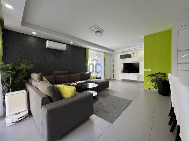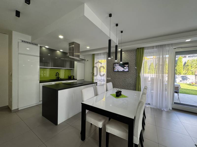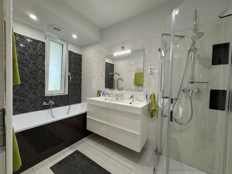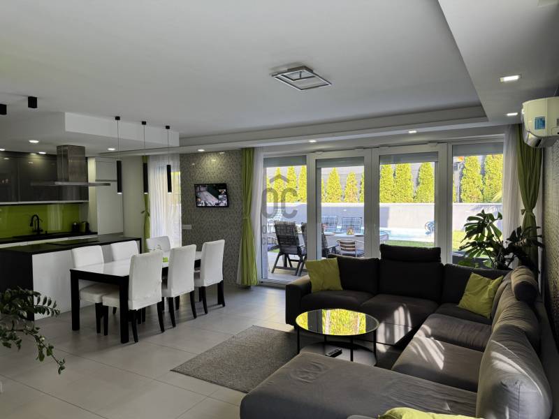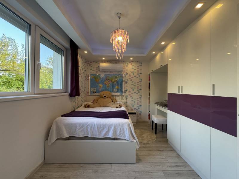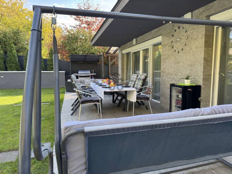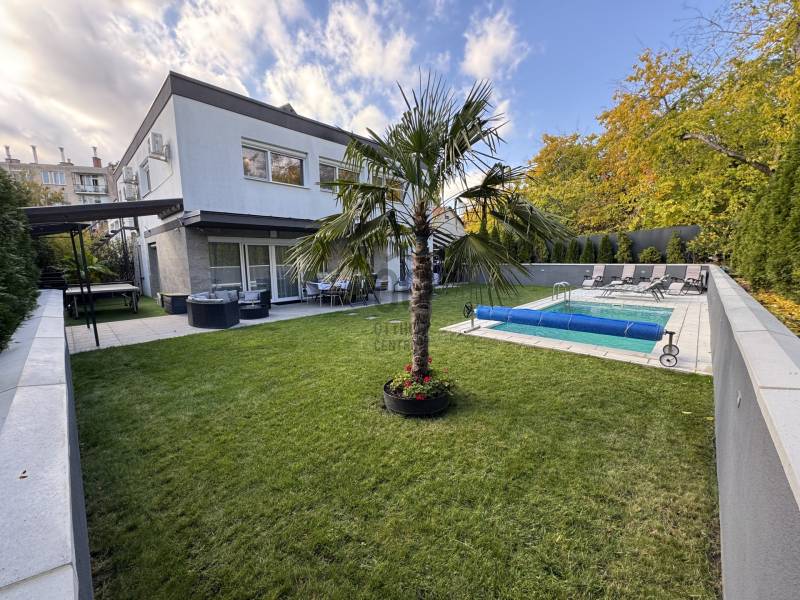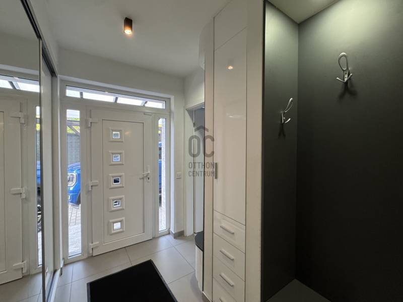 PRÉMIUM MINŐSÉGŰ ÚJSZERŰ IKERHÁZHÁZ FÉL, MEDECÉVEL, HŐSZIVATTYÚVAL ÉS NAPELEMMEL!Sashalmon csendes utcájában eladó ez a 160 m2-es kétszintes prémium kivitelezésű és felszereltségű ikerházfél, dupla garázzsal, illetve 34,5 m2-es terasszal.A telekmére 532 m2 ami kiemelkedőnek számít ebben a kategóriában. Az épületben összesen három lakás került kialakításra.A ház szinte új építésű amely 2016-ban épült.Szerkezet:•30-as porotherm tégla•betonfödém a földszint és emelt fölött is•15 cm homlokzatszigetelés, 15 cm aljzatszigetelés és 35 cm tető hőszigetelés•3 rétegű, 7 légkamrás nyílászárók elektromos alumínium redőnnyel és szúnyoghálóval•hűtő-fűtő 16 Kwh-os Panasonic All in one hőszivattyú, minden helyiségben padlófűtés, a garázsban isa hálószobákban fal hűtés•kétleállású garázs + egy fedett gépkocsibeállóFelszereltség:•a hálószobákban beépített szekrények•a nappaliban és az emeleti lakásban 1-1 db fali klíma található•elektromos redőnyök távirányítóval + applikáción keresztül használható•3 zónás riasztórendszer színes érintőképernyős LCD kijelzővel és applikációról is működtethető•8 csatornás kamerarendszer telefonos applikációval•elektromos kerítés és garázskapu távirányítóval és távoli vezérlés funkcióval•10,2 KWH-os napelemrendszer 3 x 25 amperes SZALDÓ MÉRŐVEL•3 x 16 amperes GEO TARIFÁS óra napi 20 órában kedvezményes tarifával•parkosított udvar öntözőrendszerrel•3x6 méteres épített medence külön hősszivattyús fűtési rendszerrel.Meglepően alacsony rezsiköltség:Villany költség kb 9.000 Ft/ hóVíz kb 14.000 Ft/hóSzemét díj kb 3000 Ft/ hóGáz nincs az ingatlanban.A rezsi díj egy lakásra együtt értendő beleértve a medencefűtést és az öntözőrendszert is.