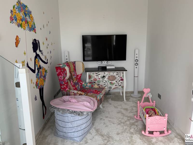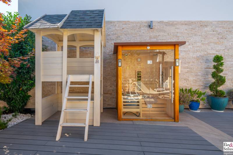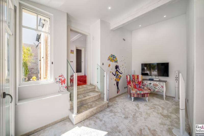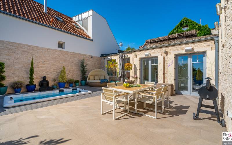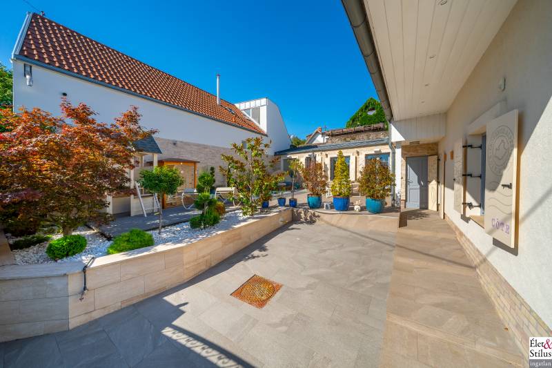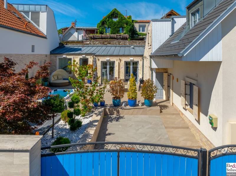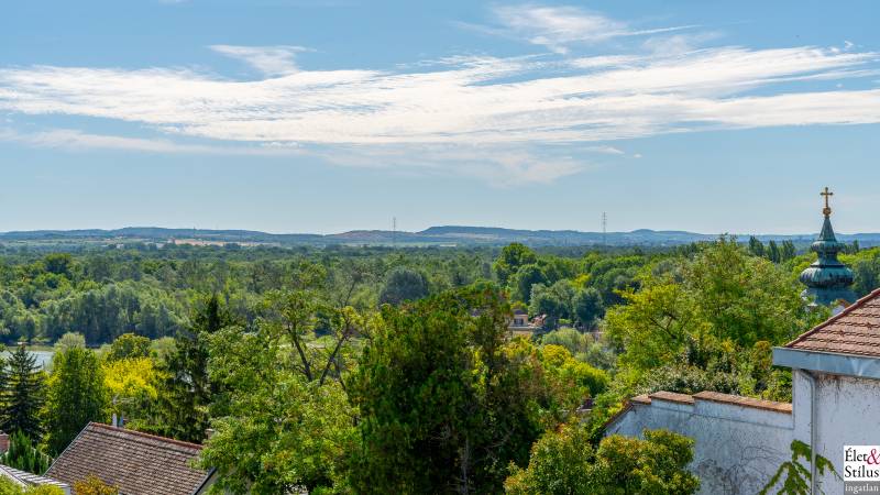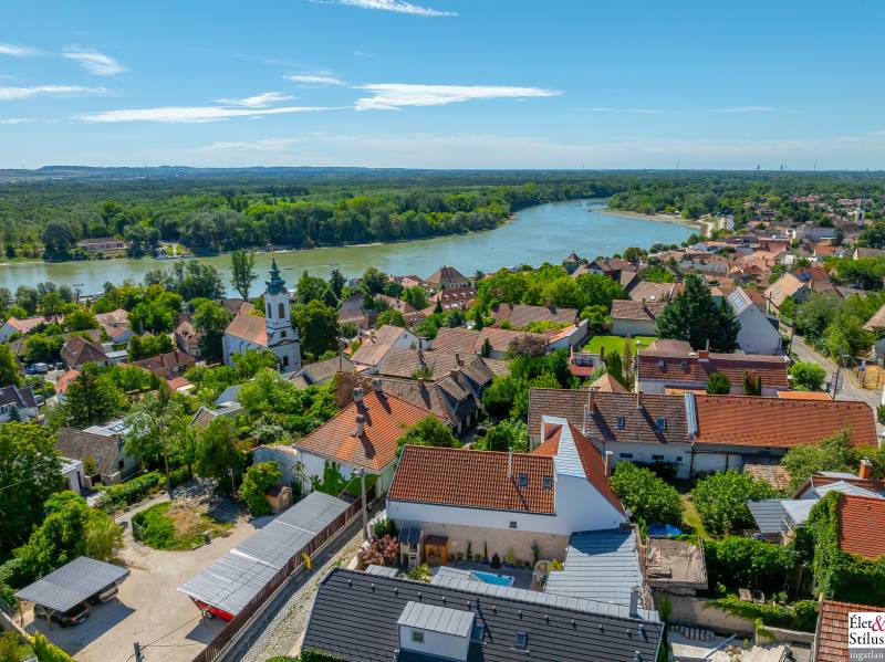 Ékszerdoboz Szentendre Óvárosában!Panoráma a Dunára!Modern? Izgalmas? Színes? Vidám?Igen!!! Ha mindezt szereti, megtalálta új otthonát!Szentendre Óvárosának egy kis csendes utcácskájában eladó egy kétszíntes, 200 nm-es, 5 szobás, 3 fürdőszobás, minőségi, családi ház.Gyalogos bejáratunkon belépve vagy kétszárnyú garázskapunkon behajtva, 450 nm-es intim kertünkbe érkezünk, amelyben 6-8 személyes, medencének beillő nagyságú jakuzzing, kis szaunaházunk és napozóágyunk fogad.Házunkba belépve, előszobánkból jobbra található, hatalmas, 20 nm-es hálószobánk, fürdővel és mellékhelyiséggel.Balra, lenyűgöző, szinteltolásos, ultramodern, nappali-konyha-étkező került kialakításra.A nappaliból egy hidralikus szerkezet segítségével, \"titkos\" lejáraton, lépcsőn keresztül, \"rejtett\" borospincénkent fedezhetjük fel.Tovább haladva, L alakú otthonunkban elfordulva, két gyerekszoba, fürdőszoba és tároló vár minket.Fényárban úszó, színkavalkádban játszó, üvegfalú lépcsönkön felfelé haladva jutunk tetőterünkbe, ahol közlekedőnkből, felső szintünk két oldalán, két hálószobánk, középen fürdőszobánk, mosokonyhánk és kazánházunk lett kiépítve.Extrák tekintetében, pazar panorámás, Dunára néző kilátásunk páratlan.A már említett extra minőségű kivitelezés, az ötletes megoldások, jakuzzis medencénk, szaunaházunk, ablakainkon spalettnik, 15 cm-es szigetelésünk, mind mind növelik komfortérzetünket, a mesés utcácskánkban található házikónkban.Lokáció tekintetében is el vagyunk kényeztetve, hiszen pár perc sétára a Dunapart, Szentendre sétálóutcái, éttermei, jelegzetes forgataga.Mind a HÉV, mind autónk használatával, a tökéletes infrastruktúrának köszönhetően, fél órán belül Budapest szívében találhatjuk magunkat.Irányár: 348 millió forintSzaka József +36 30 691 0908 Élet&Stílus IngatlanirodaTovábbi ingatlanokat a honlapunkon talál: eletstilusingatlan huENERGETIKAI TANÚSÍTVÁNY (zöldkártya ingatlanhoz)2012. január 1.-től a használt lakások adásvételénél is kötelező! Hívjon! Elkészítjük Önnek!ÜGYVÉD-0,7%Megbízható ügyvédre van szüksége? Irodánk ügyvédje a vételár 0,7 %-ért elkészíti az adásvételi szerződését. Ha kínálatunkból vásárol, akkor még ennél kedvezőbb is lehet ez a díj.LAKÁSBIZTOSÍTÁSIngatlant vásárolt? Vagy a régi biztosítását lecserélné? A Magyarországon tevékenykedő összes biztosító ajánlatai közül kiválasztjuk Önnek az árban és a szolgáltatás minőségében a leginkább megfelelőt. Mindezt teljesen ingyen.HITELCégünk hiteltanácsadója - a velünk leszerződött - Magyarországon található összes bank ajánlata közül megtalálja Önnek személyre szabottan a legjobbat!LAKBERENDEZÉSNincs ötlete, hogy mit lehetne kihozni a lakásából, hogyan lehetne újjá varázsolni? Mi segítünk Önnek!LAKÁSFELÚJÍTÁSMegbízható szakemberre lenne szüksége a lakásfelújításhoz? Nálunk megtalálja!